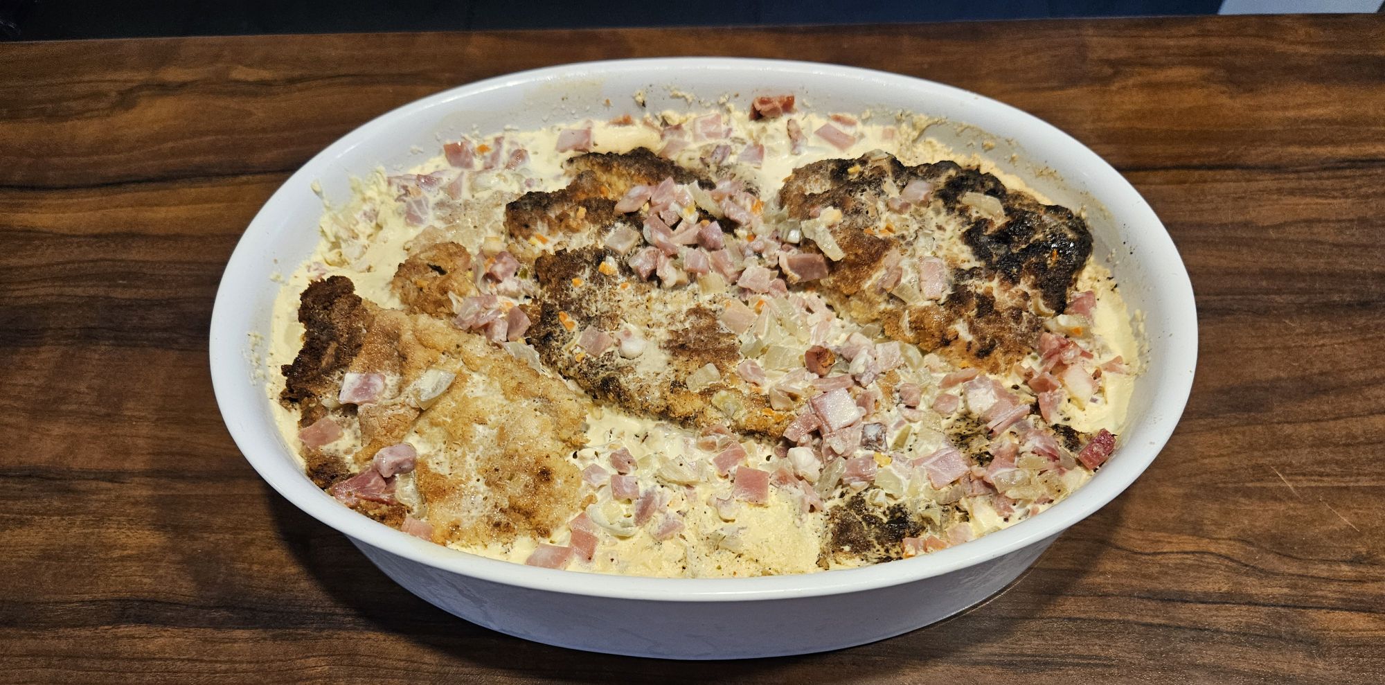 Das Gericht geht folgendermaßen, man klopft Schnitzel hauch dünn, paniert sie und bäckt sie in Butterschmalz raus (dabei müssen die Schnitzel noch gar nicht ganz durch sein). Danach schneidet man Speck, Schinken und Zwiebel klein und schwitzt sie in der Pfanne an. Die Schnitzel legt man in eine Auflaufform, gibt was von den Speck-Schinken-Zwiebel-Masse drüber, dann kommt die nächste Schicht Schnitzel und wo weiter. Und jetzt kommt der Kalorienzauber: Man mixt Sahne, Schmand und Gemüsebrühe zu einer Soße, der Thermomix eignet sich dafür übrigens sau gut, und diese Soße kippt man dann über Schnitzel in der der Auflaufform, bis alles bedeckt ist.