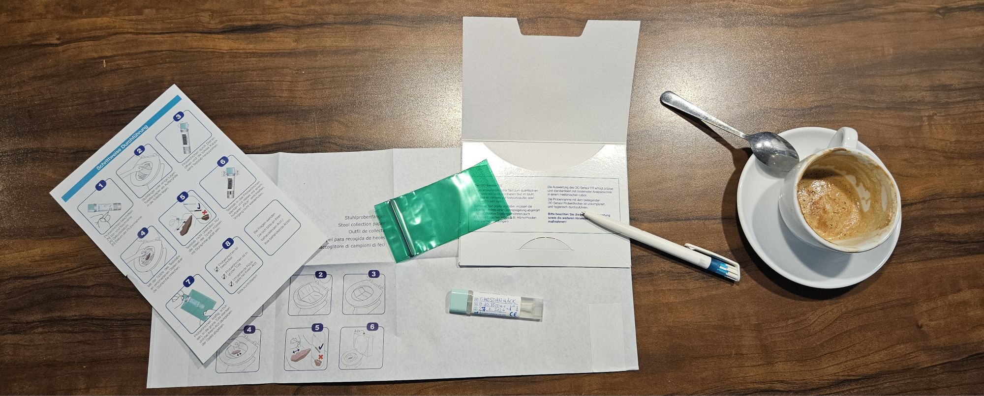 Im Paket war so ein Teil dabei, das man auf die Klobrille kleben kann, da kann man dann drauf kacken und die Probe nehmen, das war mir aber zu umständlich und ich hatte auch etwas Bedenken, dass der Papierklumpen dann das Abflussrohr verstopfen könnte, deshalb habe ich mit mehreren Lagen Klopapier gearbeitet. Der Plan ist aufgegangen, ein guter Kaffee als Trigger und keine 20 Minuten später war die Probe schon beim Arzt. Stuhlprobe kann ich!