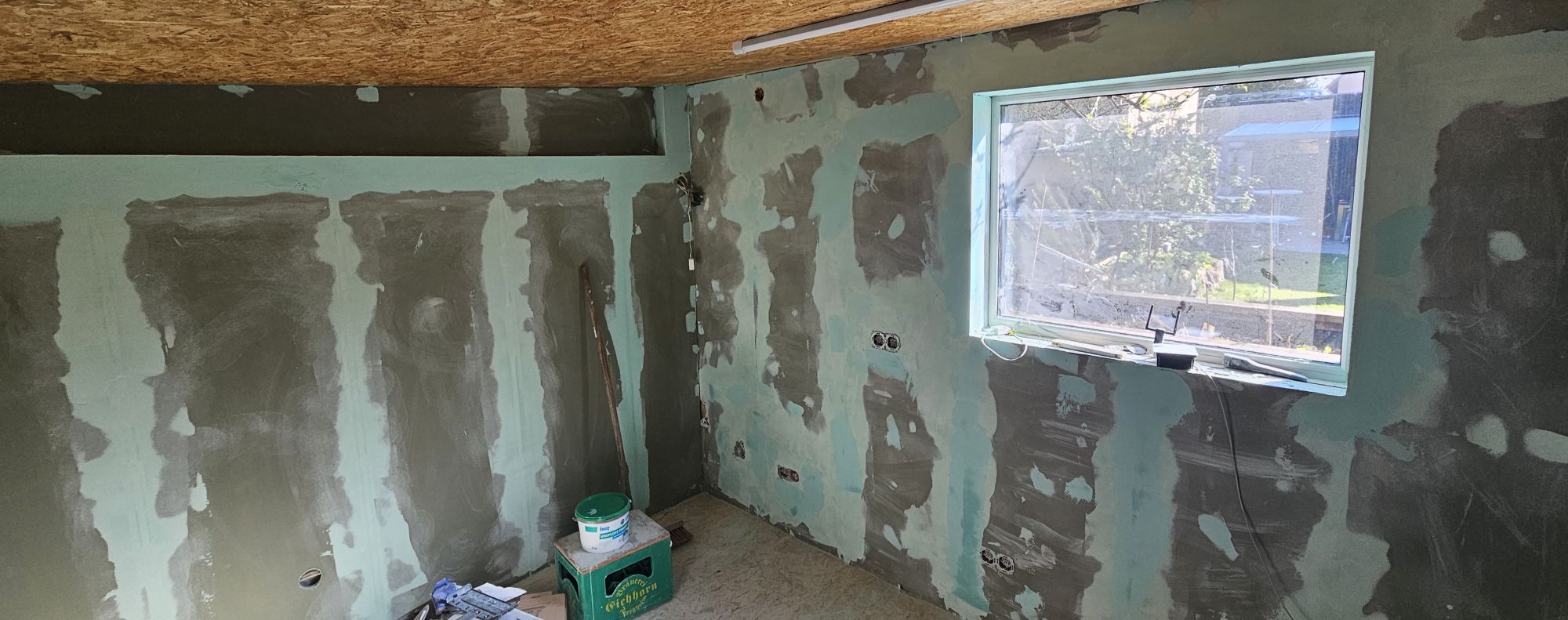 Das Bild zeigt den derzeitigen Zustand vom #GartenhausEins, der Status ist „Trockenbau fertig“. Der Unterschied zwischen mir und einem Trockenbauer ist ja, dass ich kein Trockenbauer bin. Deshalb schaut das Gespachtelte auch so aus wie es ausschaut. Bei den Trockenbauern, die das Bad gemacht haben, wurde fast gar nicht geschliffen, O-Ton: „die Kanten müssen wir etwas brechen“. Ich dagegen habe geschliffen wie blöd, weil ich auch gespachtelt habe wie blöd und das musste ich, weil der Trockenbau eine iterative Erfahrung war.